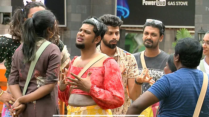 “ரெண்டு பேரும் பொம்பளை கெட்டப்பல வந்தீங்க தெரியுமா... இன்னம் கொஞ்ச நேரம் நீங்க இருந்திருந்தா நிச்சயம் நான் சிரிச்சிருப்பேன். அதிலும் நீ பைத்தியக்கார கிழவி கெட்டப்பல வந்தது ரணக்கொடூர காமெடி” என்று பிறகு நிரூப்பிடம் சொல்லிக் கொண்டிருந்தார் ராஜூ. புதிய தலைவரான சிபி, ‘இங்க்கி பிங்க்கி பாங்க்கி’ போட்டு அணிகளைப் பிரித்தார். ‘பிரியங்கா, நீங்க சமையல் டீம்ல இருந்தே ஆகணும்” என்று இவர் கெஞ்ச, முதலில் மறுத்தாலும் பிறகு பெரிய மனதுடன் ஏற்றுக் கொண்டார் பிரியங்கா. (வீட்டில் இருக்கும் அணிகளில் சமையல் டீம்தான் முக்கியம். எப்போதும் கேமராவில் காட்சியளிக்கலாம். மற்றும் உணவை நம்பி மற்றவர்கள் இருப்பதால் யாரும் பகைத்துக் கொள்ள மாட்டார்கள்).
