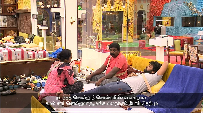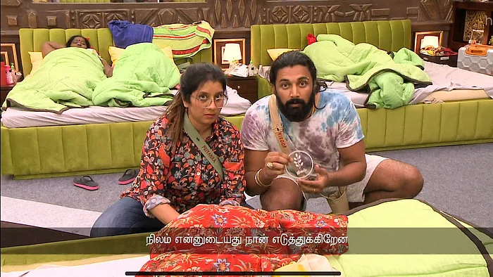 இசை வைத்திருந்த நாணயத்தை யாரோ சுட்டு விட்டார்கள் போலிருக்கிறது. ‘’பத்திரமா வெச்சுக்கோ” என்று சுருதி ஏற்கெனவே எச்சரித்திருந்தார். இசை இப்படியா வெள்ளந்தியாக இருப்பார்? “ண்ணா... எடுத்திருந்தா கொடுத்திருங்கண்ணா” என்று வளர்ந்து கெட்ட நிரூப்பிடம் பரிதாபமாகக் கெஞ்சிக் கொண்டிருந்தார் இசை. CCTV இல்லாத துணிக்கடையில் ஒரு ஆளையே மேலே ஏற்றி உயரத்தில் அமர்த்தி வைத்திருப்பதைப் போல, உயரத்தில் அமர்ந்து எல்லோரையும் கண்காணித்துக் கொண்டிருந்தார் அபினய். (ஹப்பாடா... நமக்கு ஒரு கேமரா மிச்சம்... இது பிக்பாஸ் டீமின் மைண்ட் வாய்ஸ்).