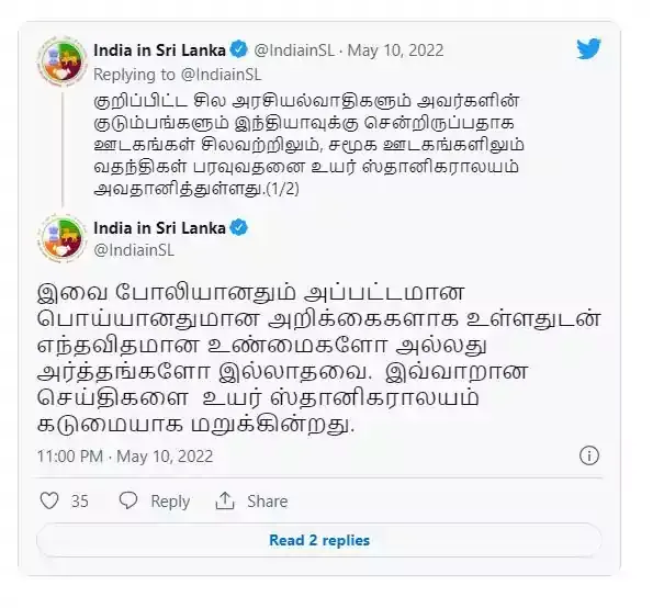 குறிப்பிட்ட சில அரசியல்வாதிகளும் அவர்களின் குடும்பங்களும் இந்தியாவுக்கு சென்றிருப்பதாக ஊடகங்கள் சிலவற்றிலும், சமூக ஊடகங்களிலும் வதந்திகள் பரவுவதனை உயர் ஸ்தானிகராலயம் அவதானித்துள்ளது.